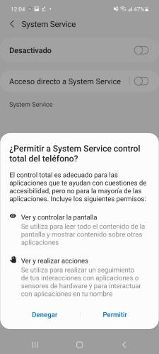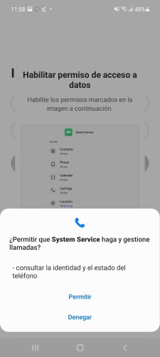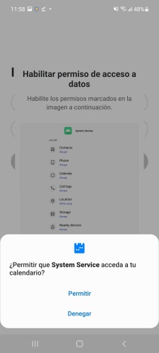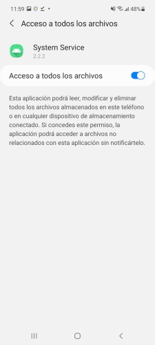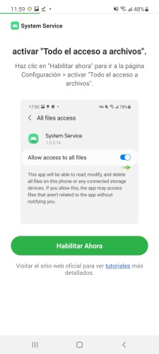 Abre el permiso "Acceso a todos los archivos" haciendo clic en el botón "Activar ahora". Te redirigirá al directorio de configuración correspondiente. Localiza "Servicio del sistema" y asegúrate de que sus permisos están habilitados antes de volver a la aplicación para continuar con la configuración.