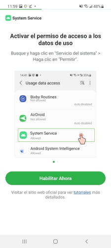 Abra el permiso "Acceso a datos de uso" haciendo clic en el botón "Activar ahora". Te redirigirá al directorio de configuración correspondiente. Localiza "Servicio del sistema" y asegúrate de que sus permisos están habilitados antes de volver a la aplicación para continuar con la configuración.