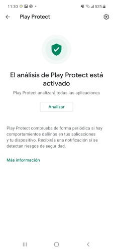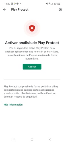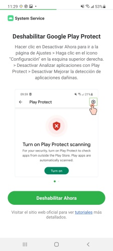 Desactiva Google Play Protect haciendo clic en el botón "Activar ahora". Te redirigirá a la página de Google Play Protect. Haz clic en el icono de configuración de la esquina superior derecha para acceder a la página de configuración. Si está activado, desactívalo. Asegúrate de que está desactivado antes de volver a la aplicación y, a continuación, haz clic en "Desactivado" para pasar a la siguiente configuración.