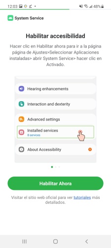 Abra el permiso "Accesibilidad" haciendo clic en el botón "Activar ahora". Te redirigirá al directorio de configuración correspondiente. Busca la opción "Apps instaladas" y entra en la página. Localice "Servicio del sistema" en la página "Aplicaciones instaladas". Si actualmente está desactivado, actívelo. En la ventana emergente, haz clic en "Permitir" para asegurarte de que sus permisos están habilitados. Después, vuelve a la aplicación para continuar con la configuración.