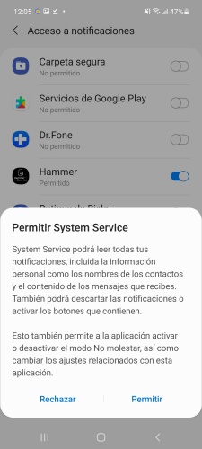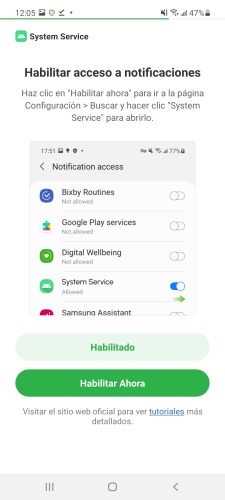 Abra el permiso "Acceso a notificaciones" haciendo clic en el botón "Activar ahora". Le redirigirá al directorio de configuración correspondiente. Localice "Servicio del sistema" y, si actualmente está desactivado, actívelo. En la ventana emergente, haz clic en "Permitir" para asegurarte de que sus permisos están habilitados. Después, vuelve a la aplicación para continuar con la configuración.
