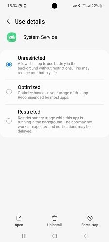 Habilite la ejecución en segundo plano o el inicio automático haciendo clic en el botón "Habilitar ahora". Te redirigirá al directorio de configuración correspondiente. Busca la opción "Batería" y entra en la página. Elige "Sin restricciones", luego vuelve a la aplicación y haz clic en "Desactivado" para pasar a la página de finalización.