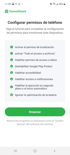 - 1.Por favor, asegúrese de que cada permiso está configurado correctamente. De lo contrario, Parentalguard no se puede ejecutar de una manera adecuada.